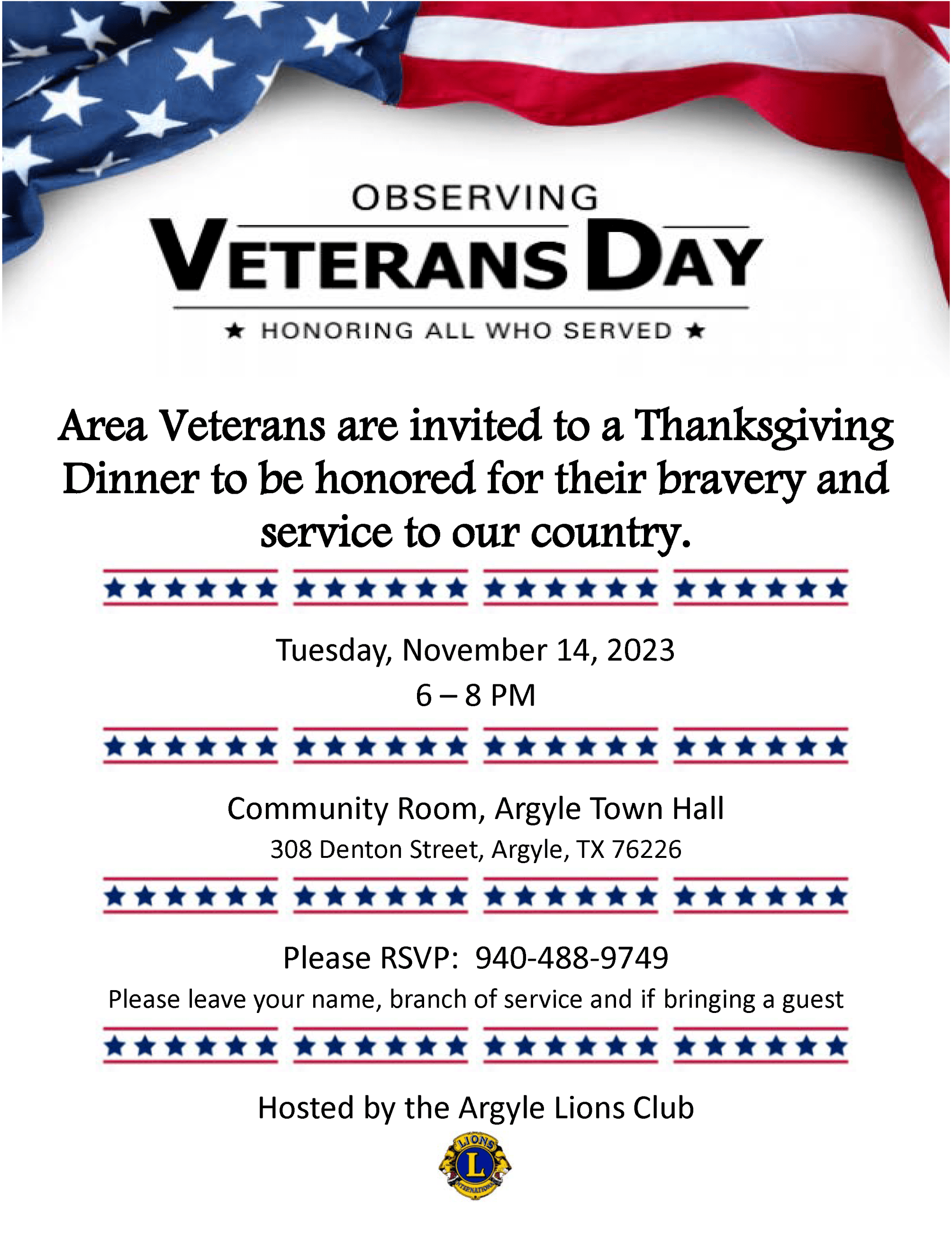 You are invited to join the Argyle Lions Club for a Veterans’ Thanksgiving Dinner on Tuesday, November 14 from 6:00-8:00 p.m. at Argyle Town Hall. The dinner is limited to the first 50 reservations. Make your reservation by calling 940-488-9749. Please include your name, branch of service and names of guests. The Lions Club is also requesting pictures of Veteran’s be sent to Deborah Cottle at dcottle@temporah.com.