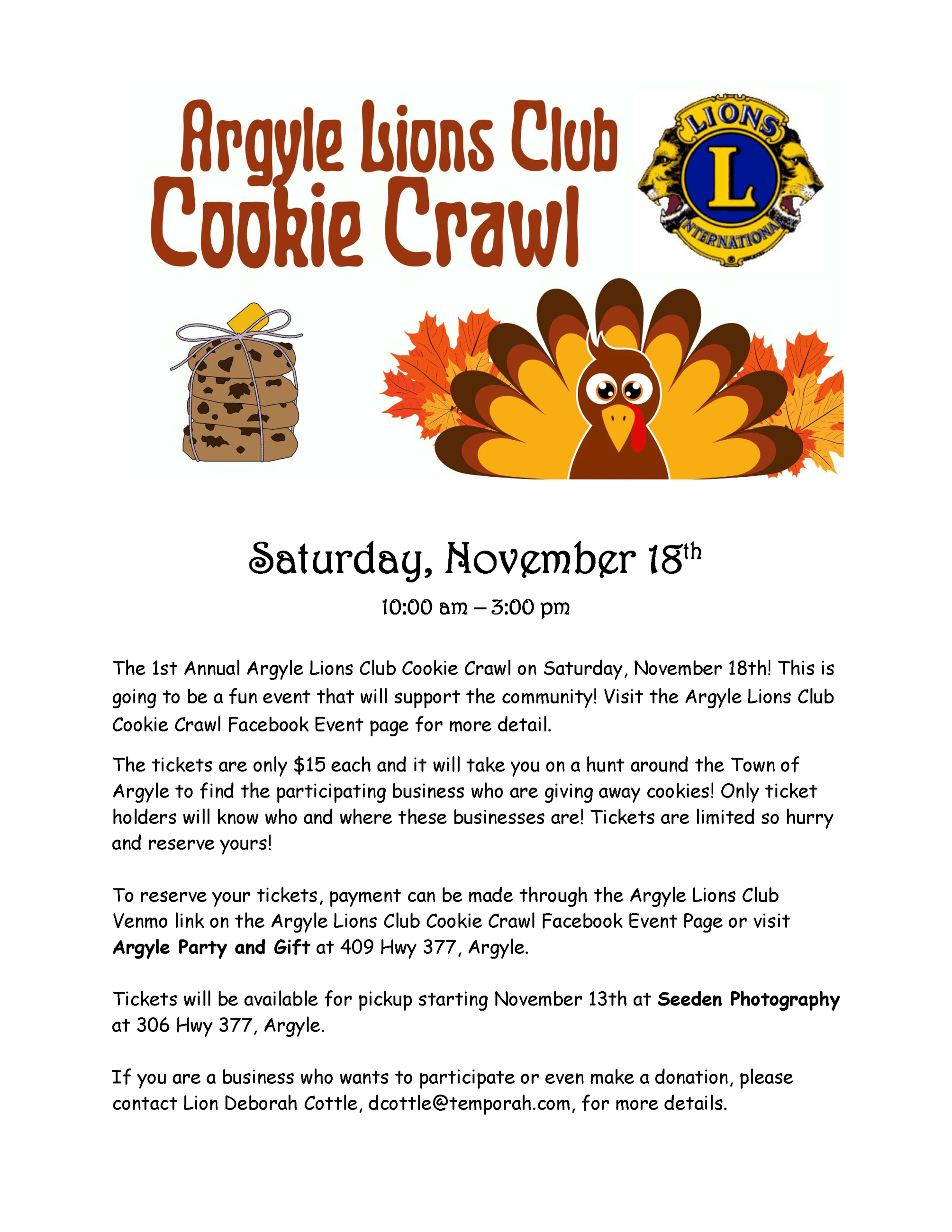 The Argyle Lions Club is hosting a Cookie Crawl on Saturday, November 18 from 10:00 a.m. – 3:00 p.m. Participants will visit participating businesses on a scavenger hunt and will be rewarded with cookies while supporting local nonprofits. For complete details and tickets visit:
